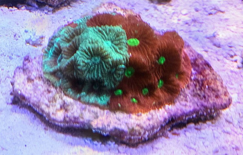 WYSIWYG!! These are a NEW LPS coral offering!! TR Cherry Lime Favia Brain LPS Coral attached to real rock! First pic is the baby you'll receive.