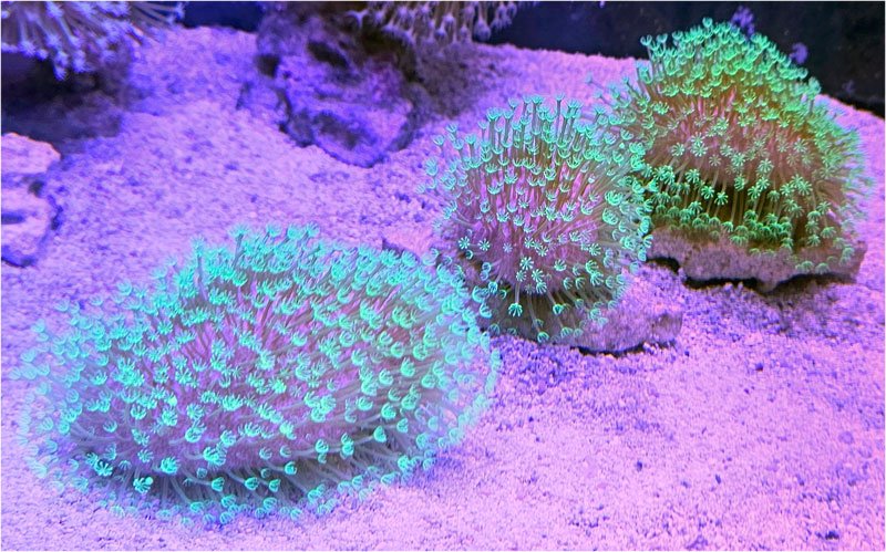 My original parent came from Australia which is know for it's extremely colorful soft corals. This one is a superb example of that! This tank raised soft coral glows green under full daylights & jumps out of the tank in the actinic blue lighting phase! It tends to grow low rather than tall like most other Toadstools. Very hardy yet a little slower grower than most. It will be a show piece for your tank like mine is below here! Give it strong light and moderate flow & it will be very happy.